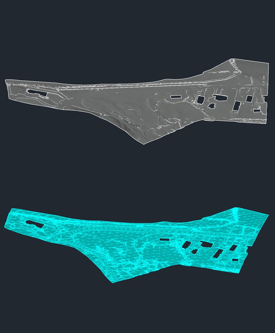 The output involves extracting points from the cloud, drafting 2D CAD features in .dwg format, mapping utilities for both ground and underground surfaces, providing topography and spot elevation labels, showing surface grades and contour grades, including pipe invert data, detailing boundary information, and supplying property details including lot, block, city, county, and state.